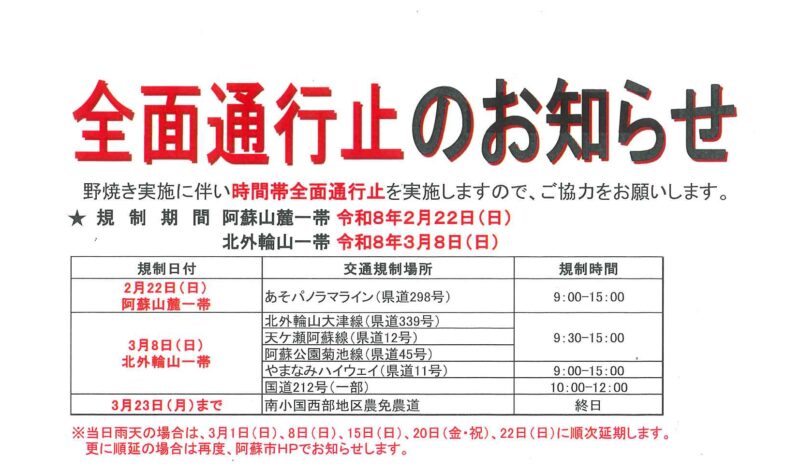 TOP > お知らせ > 阿蘇草原野焼きによる通行止めにご注意ください。